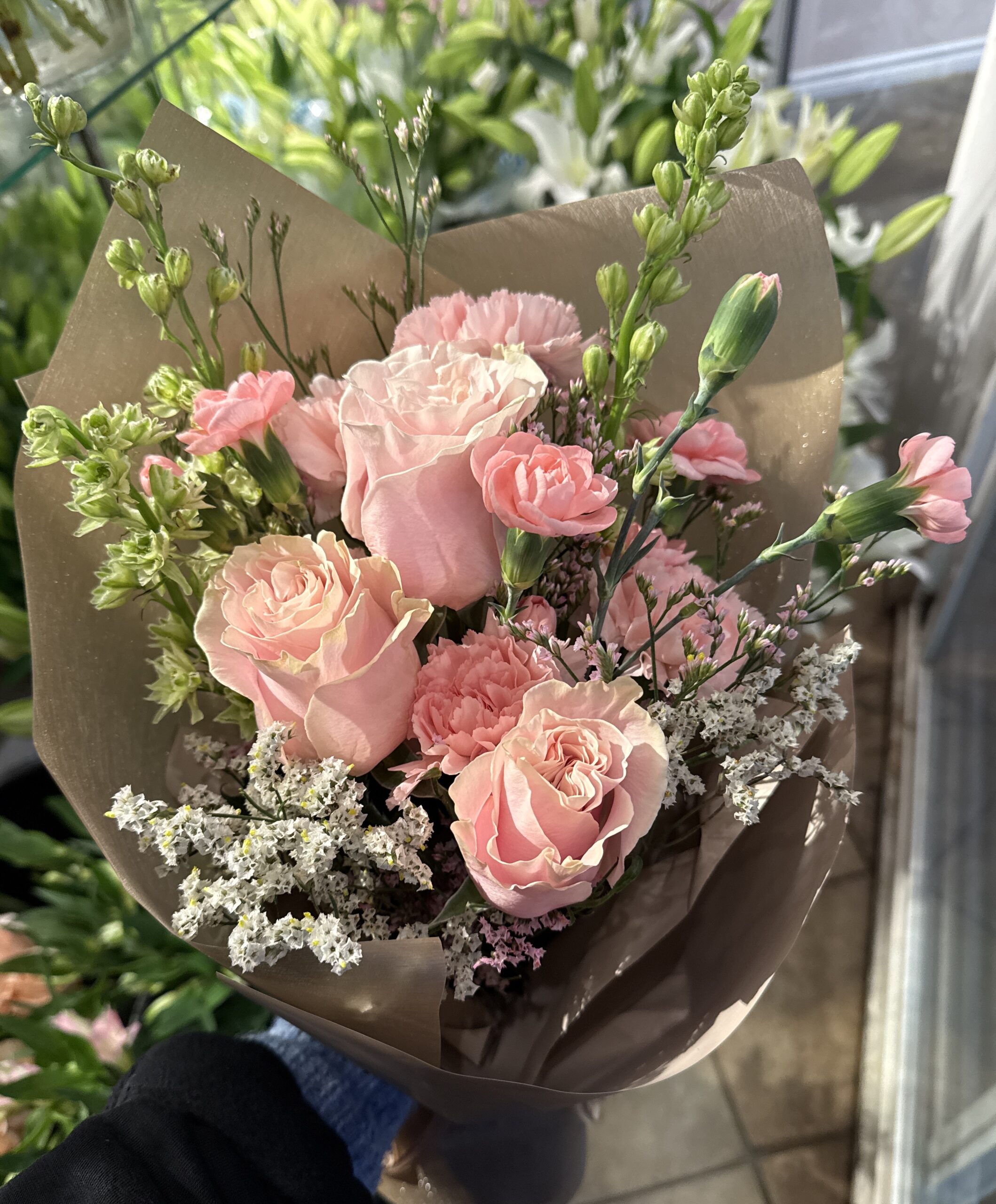 Wrapped bouquet of fresh in-seasonal blooms hand picked by florist.
